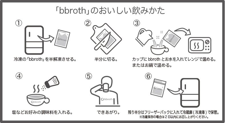 ・飲み物としてあるいは調理にお使いいただく場合、メニューにもよりますが、お一人1回あたり50〜75gを、2〜3倍(bbroth50gに対し100〜150cc)の水、出汁、牛乳等にて薄めてご利用下さい。